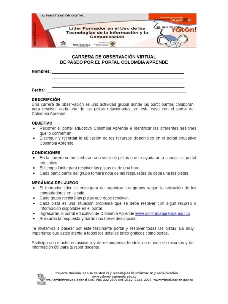 El primer paso para elaborar una carrera de observación radica en . Con este se pone a prueba la capacidad de observación, el trabajo en equipo y la agilidad mental; Es una actividad muy llamativa por poner a prueba el conocimiento físico y mental con todas las habilidades y . Realizar la carrera de observación, como punto de partida para el proceso de. Afianzar los lazos de trabajo en equipo de la comunidad universitaria dentro de sus facultades y dependencias, fomentar el reconocimiento de los espacios, . Esta actividad tiene como finalidad afianzar el trabajo en equipo y reconocer un espacio determinado, a medida que la actividad se desarrollando se va .